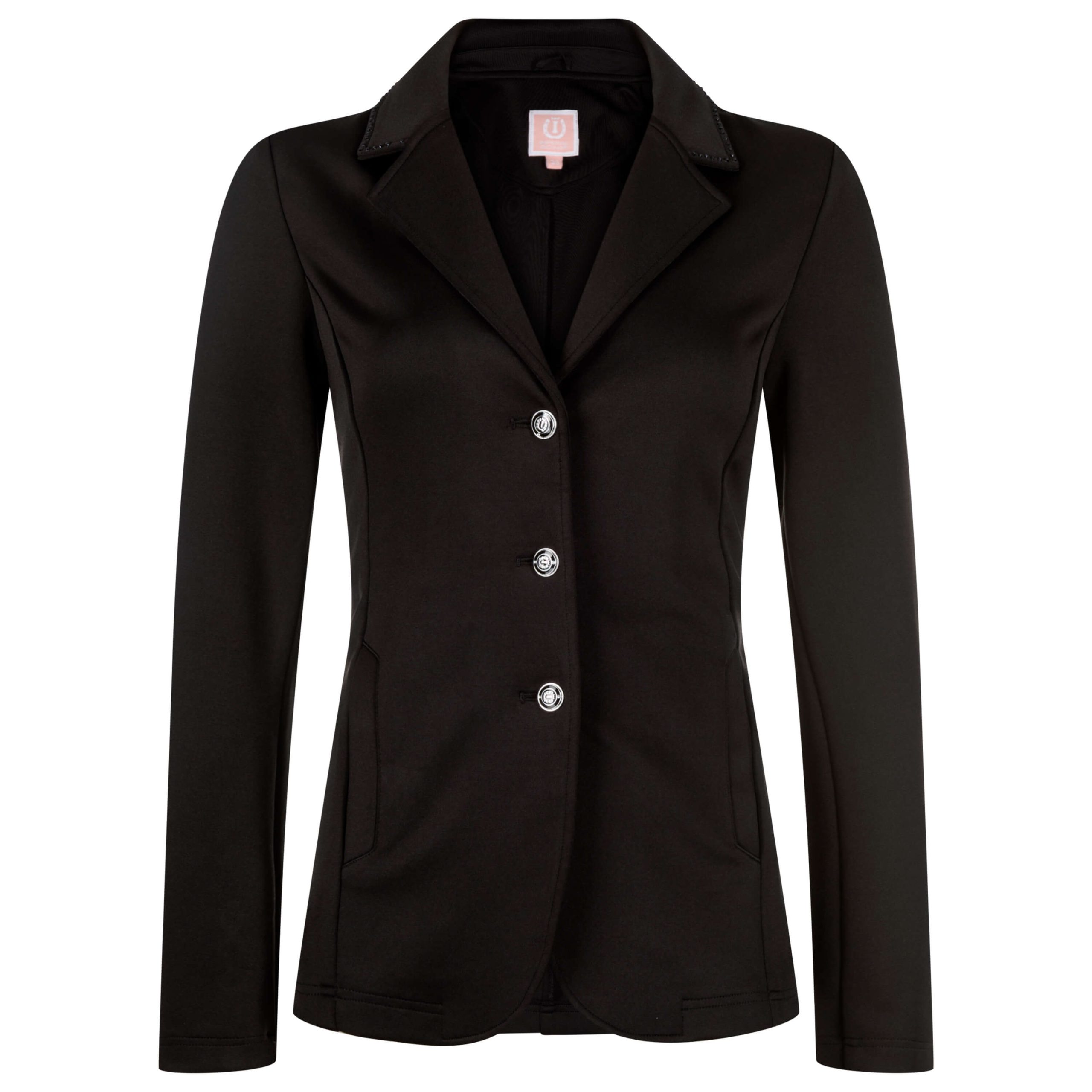 Fashionable competition jacket made of softshell fabric for very comfortable fitting and wearing. Tone in tone decorative stones along collar.