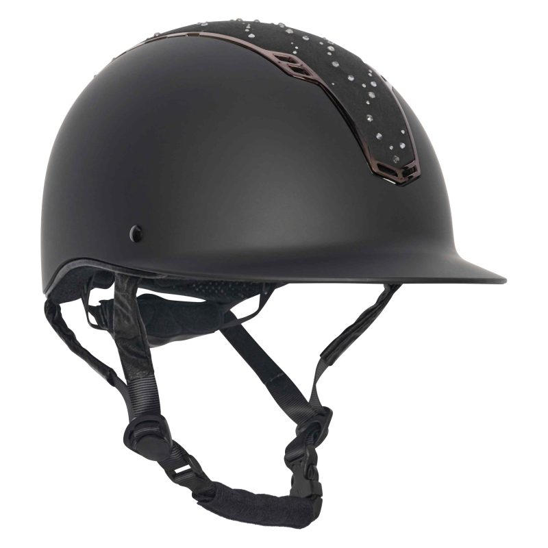 Adjustable riding helmet in light weight shell made of strong ABS material. With framed elegant structured top and 9 ventilation slots on each side to ensure maximal ventilation. The helmet comes with removeable and washable inner lining made of soft mirco fleece for extra comfort. The control knob is easy to adjust and ensure a perfect fit. EU safety standard CE VG1 01.040 2014-12.