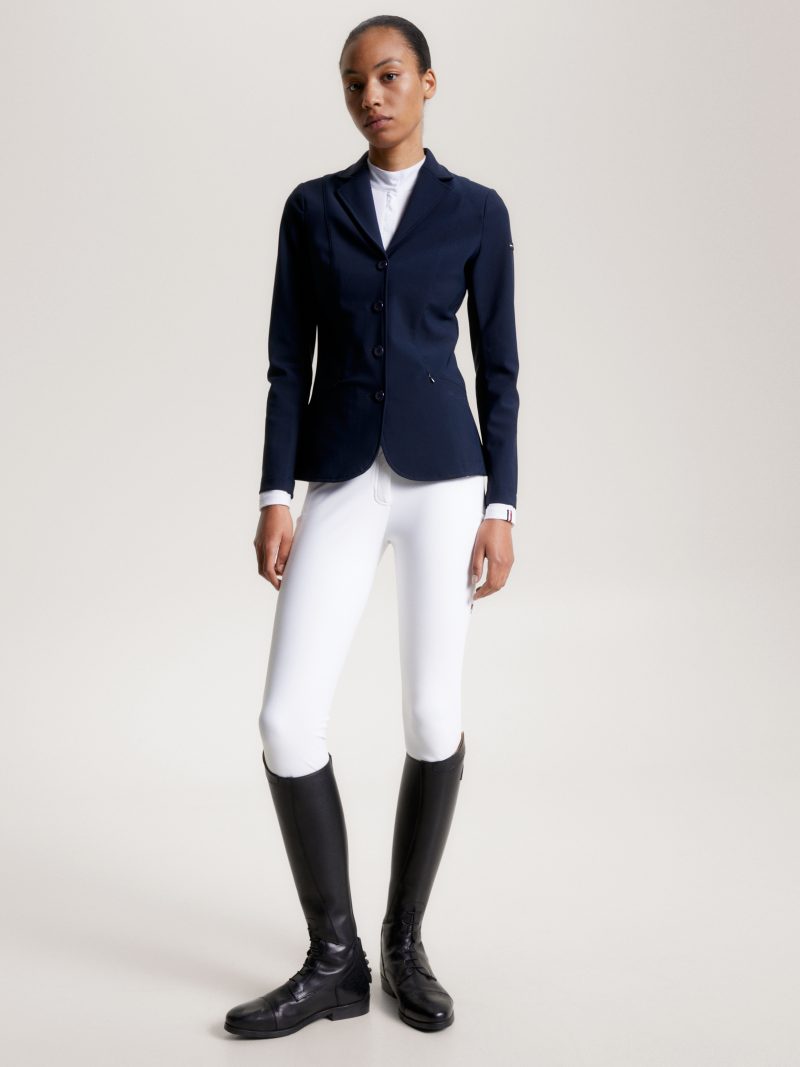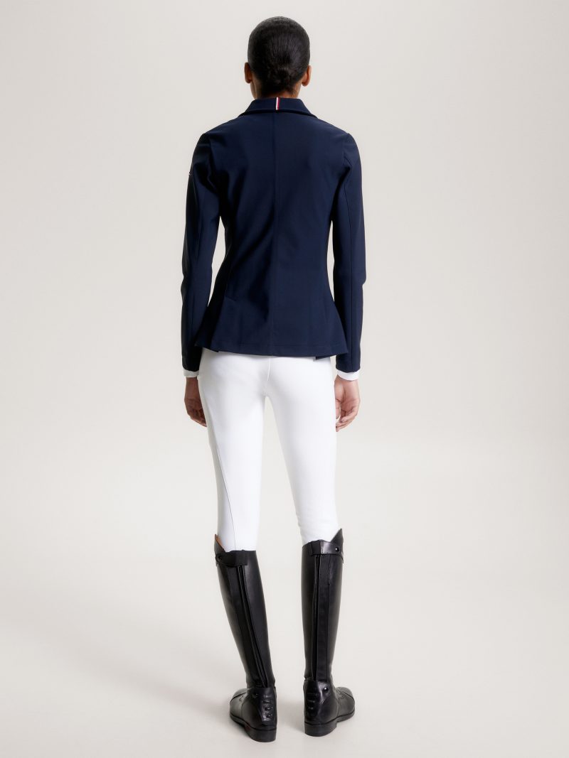 The Tribeca is a classic take on the traditional show jacket with a Tommy Equestrian twist. With its elegant yet sporty fit it is designed using a combination of shape retaining, 4-way-stretch, breathable fabric which effectively wicks moisture and allows for quick drying to keep you comfortable when it matters most. The jacket also features a water and wind repellant finish for sudden showers and more blustery days and sun guard for warmer summer shows, a logo button up front, flap pockets and traditional back side slits. The Global Stripe tape at the back collar, tonal embroidery below the pocket provide the finishing touches.